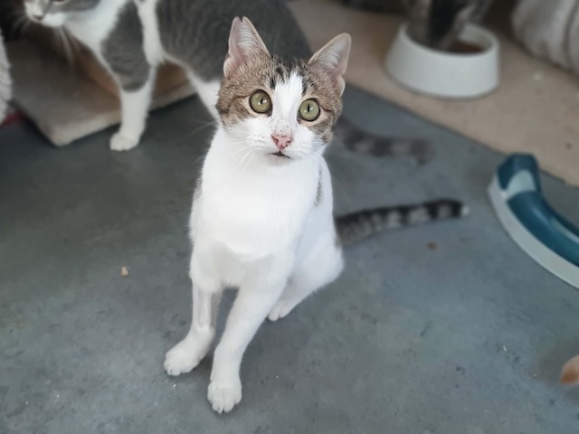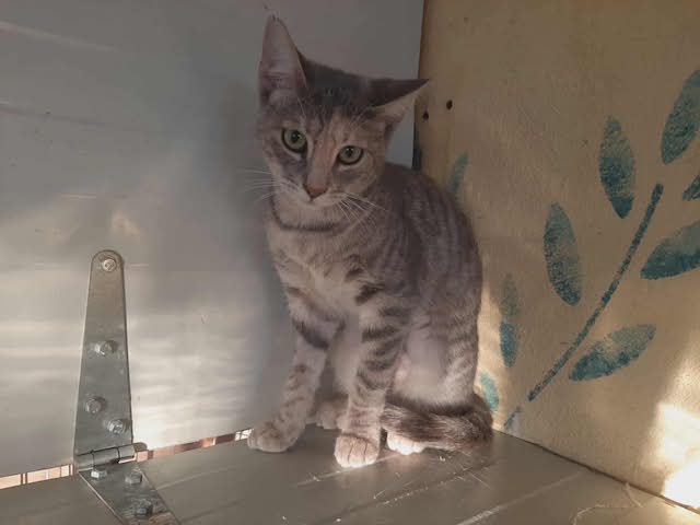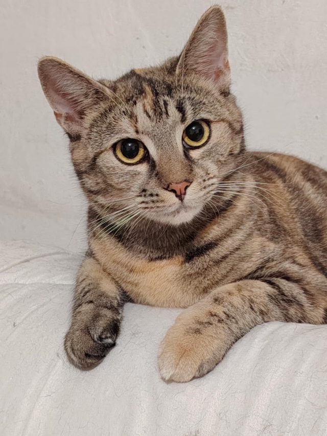 Ich bin ein lebhaftes, verspieltes Kitten mit bernsteinfarbenen Augen und einem beige-braun gestromten Fell, das mich fast wie meine Schwester aussehen lässt. Ich tobe gerne durch das Zimmer, springe auf Kratzbäume und erkunde jede Ecke. Nach dem Spielen genieße ich Streicheleinheiten und zeige mich Menschen gegenüber sehr freundlich. Mit anderen Katzen verstehe ich mich sehr gut und freue mich über Gesellschaft zum Toben und Kuscheln.